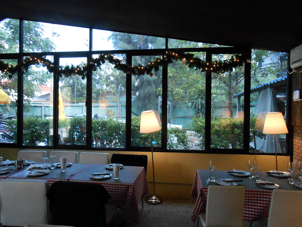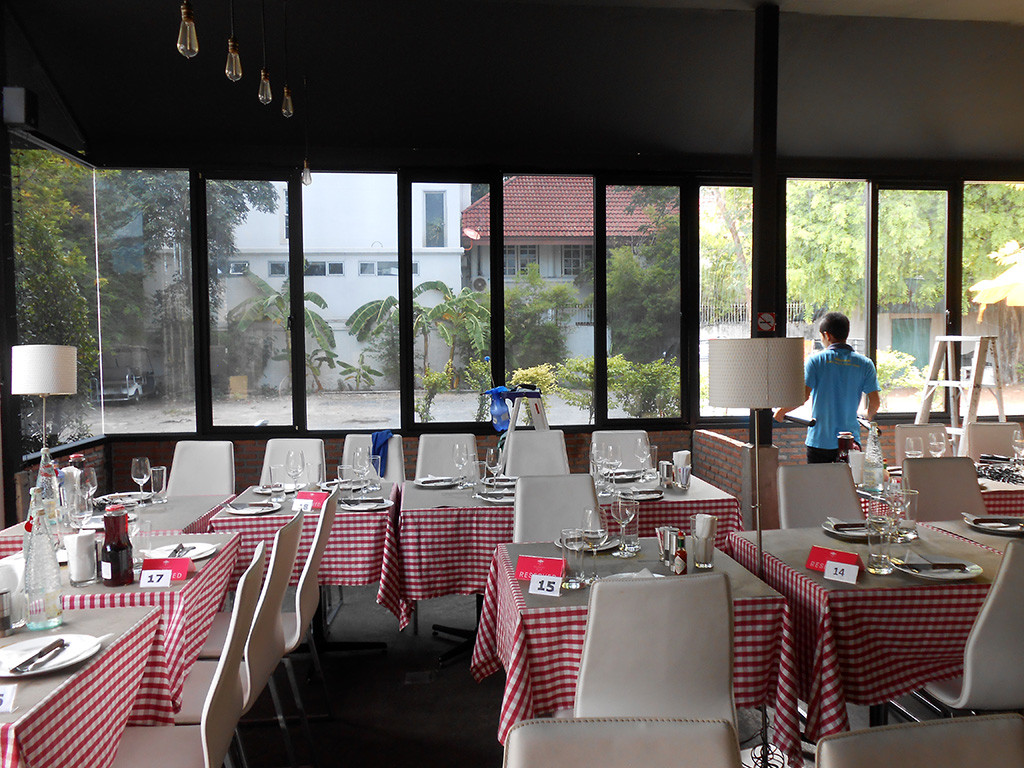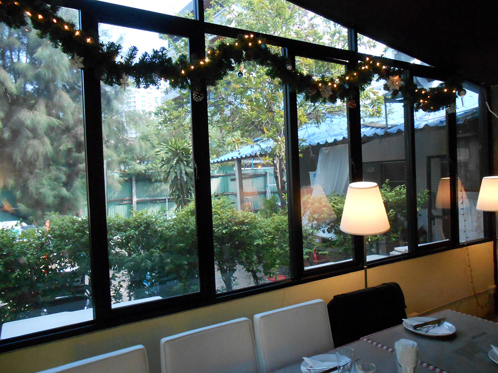 ร้านอาหารขึ้นชื่อแห่งนี้เปิดให้บริการช่วงบ่าย ลูกค้าเยอะ แต่ความร้อนเข้าเต็มๆ ทำให้แอร์ทำงานหนัก จึงจัดสินใจติดตั้งฟิล์มกรองแสงอาคาร เพื่อให้ลูกค้าได้ทานอาหารแบบสบายๆ แถมยังประหยัดค่าไฟอีกด้วย ฟิล์มกรองแสงอาคารที่เลือกใช้เป็นของ MAXGUARD รุ่น Silver black 5 ซึ่งเป็นฟิล์มสำหรับอาคารโดยตรง เวลาข้างในมองออกข้างนอกเป็นโทนสีดำ แต่ภายนอกมองเข้ามาเป็นปรอทสีเงิน สเปคฟิล์ม มีค่าแสงส่องผ่าน 5% ป้องกันรังสี Infrared 80% ป้องกันรังสี UV 99% มีค่าแสงสะท้อน 52% ค่าลดความร้อนรวม 80% ระยะเวลารับประกัน 5 ปี