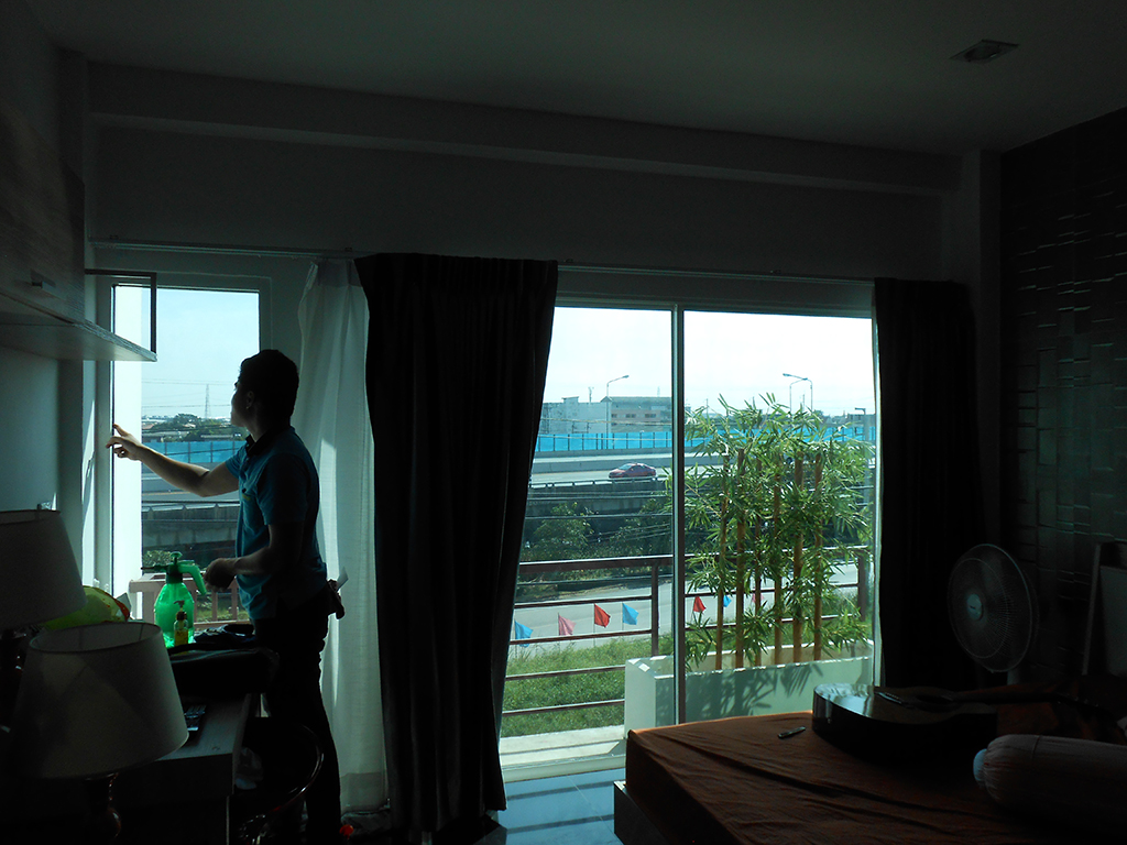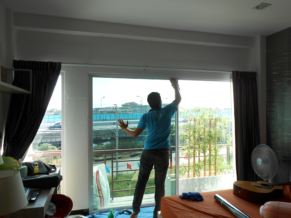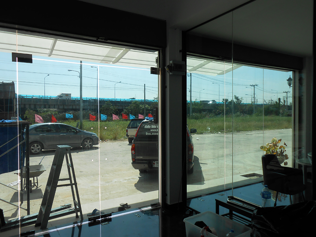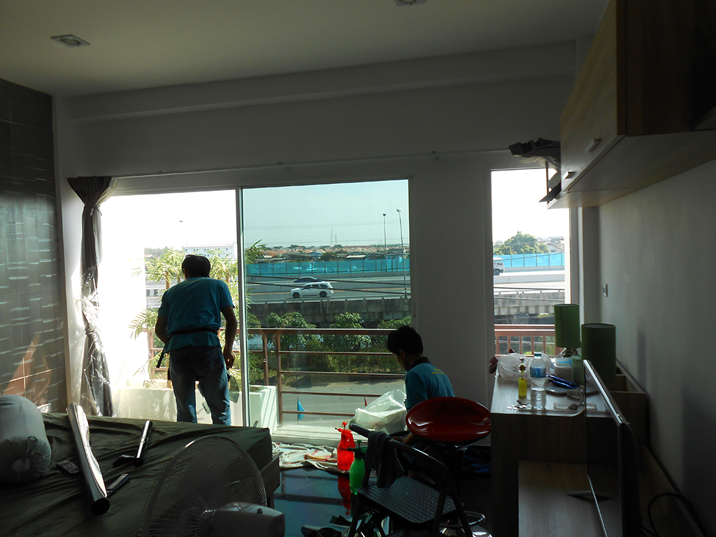 ตึกหลังนี้ทำเป็น Home office มึกระจกบานใหญ่ด้านหน้าทุกชั้น ทิศทางเจอแดดตลอดทั้งวัน ทำให้ร้อนมาก โดยเฉพาะชั้น 2-3 ที่ใช้เป็นที่พักอาศัย จึงเลือกติดฟิล์มกรองแสงเพิ่มเติมจากเดิมที่ติดม่านบังแดดอยู่ ฟิล์มกรองแสงที่เลือกใช้เป็น NEXFIL RD 65 (ปรอทเขียวกลาง) มีค่าแสงส่องผ่าน 18% ป้องกันรังสี UV 99% มีค่าแสงสะท้อน 20% ค่าลดความร้อนรวม 69% ระยะเวลารับประกัน 5 ปี