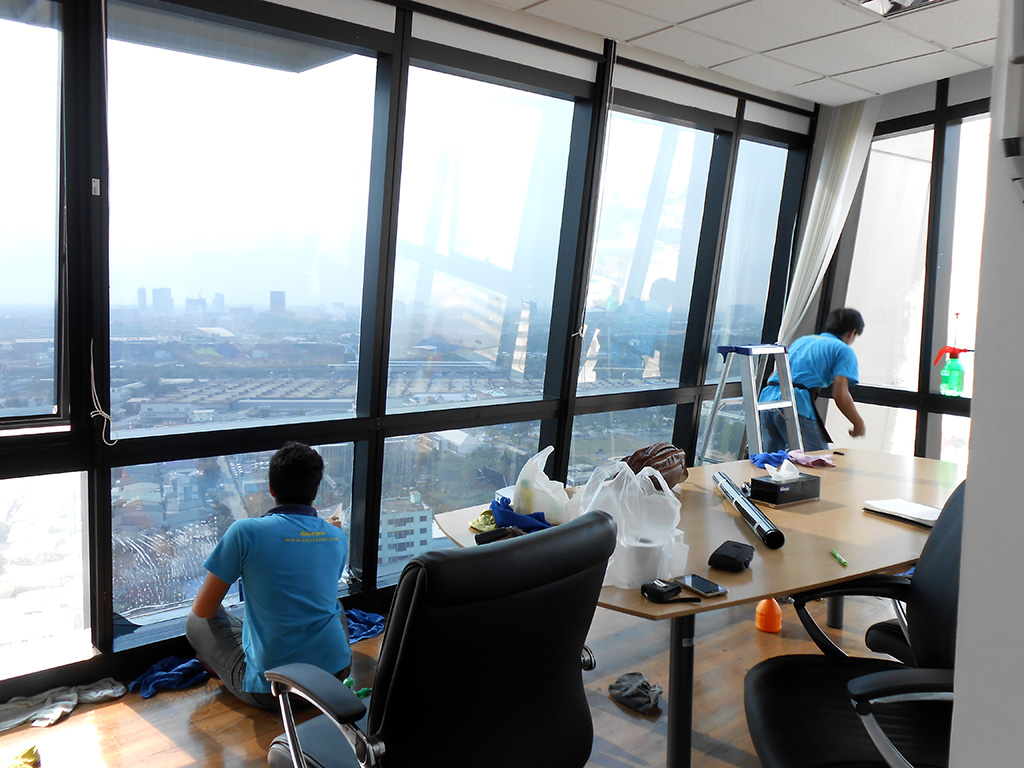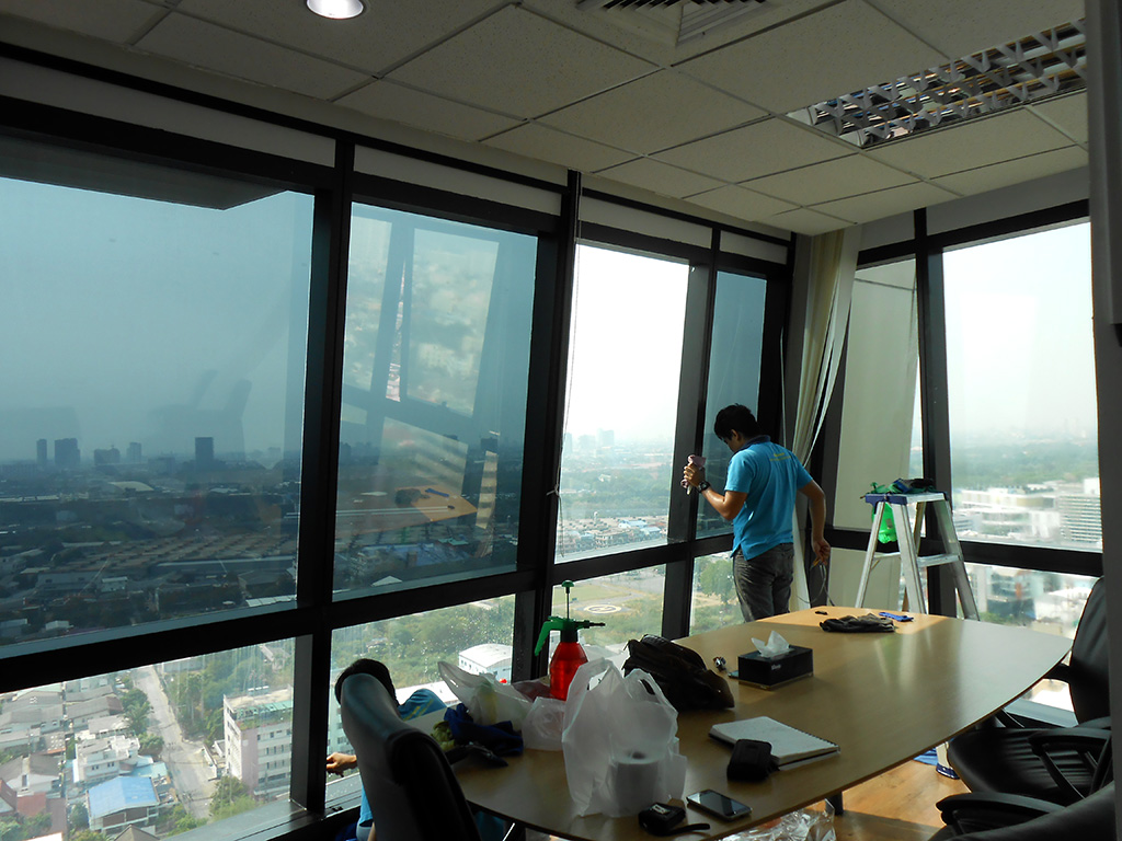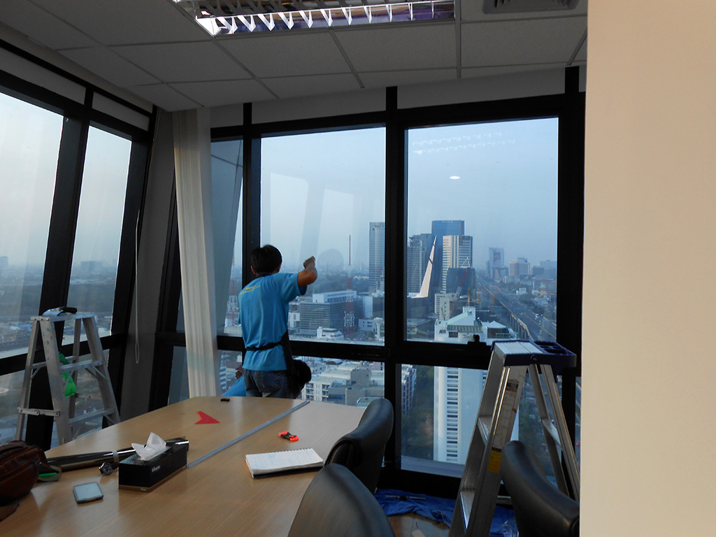 ห้องนี้เป็นห้องผู้บริหาร ซึ่งอยู่ทางด้านทิศตะวันตก เวลาตกบ่าย-เย็น แดดแรงมาก ทำให้ร้อนอบอ้าว จึงต้องติดฟิล์มกรองแสงเพื่อลดแสง และลดความร้อน ฟิล์มกรองแสงที่เลือกใช้คือ 3M BC10 มีค่าแสงส่องผ่าน 10% ป้องกันรังสี UV 99% มีค่าแสงสะท้อน 22% ค่าลดความร้อนรวม 72% ระยะเวลารับประกัน 7 ปี