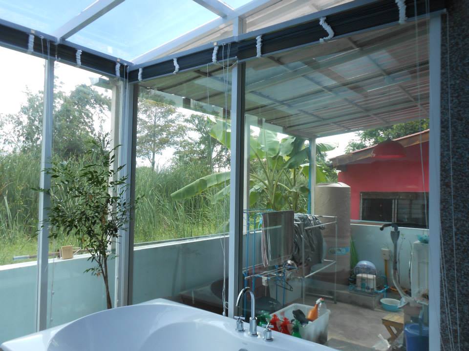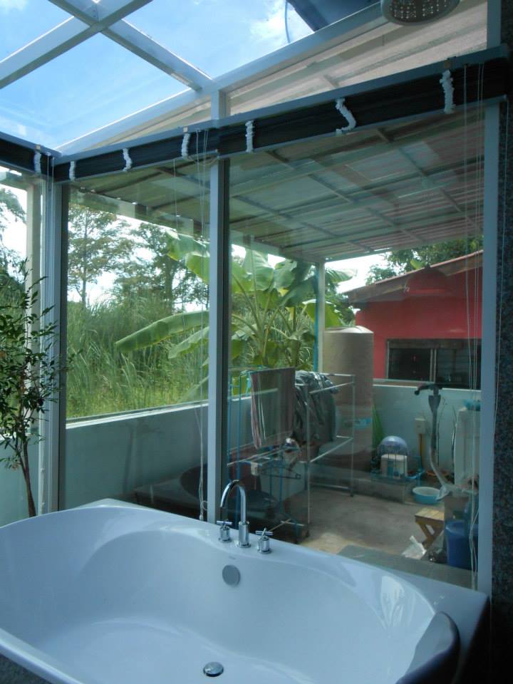 ห้องน้ำลูกค้าดีไซน์สวย หลังคาแก้วและกระจกรอบด้าน เวลาใช้งานเห็นวิวสวยสบายตา แต่ปัญหาคือแดดเข้าเต็มๆ ร้อนเหมือนตู้อบ ต้องติดฟิล์มกรองแสงเพื่อลดปัญหาดังกล่าว