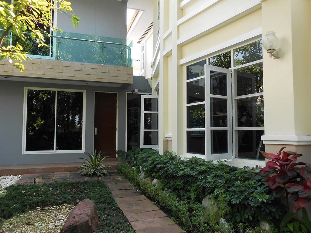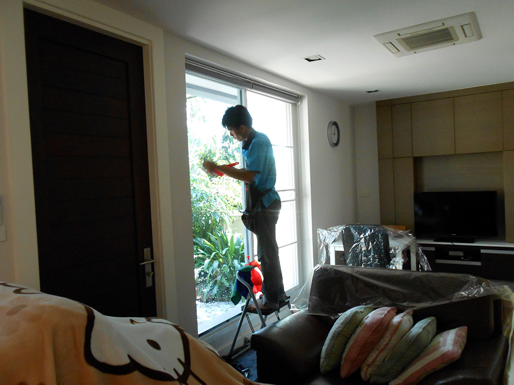 บ้านหลังนี้ปรกติจะใช้ม่านบังแดดเป็นตัวช่วยลดแสง แต่บางทีก็ทำให้ผู้อยู่รู้สึกอึดอัดมองไม่เห็นวิวภายนอก จึงติดตั้งฟิล์มกรองแสงเพื่อลดแสง ลดความร้อน และยังสามารถมองเห็นวิวทิวทัศน์ภายนอกบ้านได้อย่างสบายตา ฟิล์มกรองแสงที่เลือกใช้เป็น SMARTTEC Sm-P 20 BK มีค่าแสงส่องผ่าน 20% ป้องกันรังสี UV 99% มีค่าแสงสะท้อน 11% ค่าลดความร้อนรวม 62% ระยะเวลารับประกัน 7 ปี