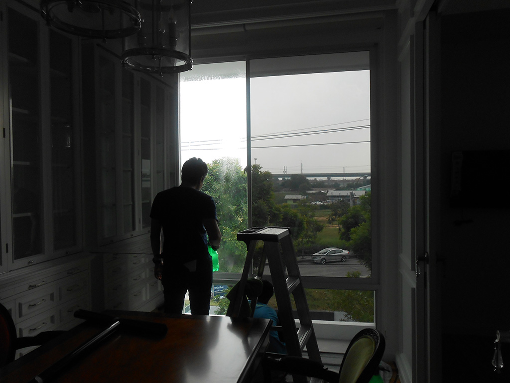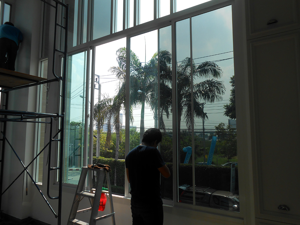 ออฟฟิศตบแต่งใหม่เพิ่งเสร็จ มีม่านทึบแสงอยู่แล้ว แต่เนื่องจากกระจกเยอะเวลาช่วงบ่ายแดดแรง ไอร้อนเข้าทำงานลำบาก การติดตั้งฟิล์มกรองแสงอาคารช่วยลดความร้อนลงไปเยอะ ทำให้ทำงานได้สบายขึ้น ฟิล์มกรองแสงอาคารที่เลือกใช้เป็นของ MAXGUARD รุ่น Steel15 ซึ่งเป็นฟิล์มกรองแสงสำหรับติดอาคารโดยตรง ที่ไม่ทึบจนเกินไป ลดแสง และลดความร้อนได้ดี เงาสะท้อนต่ำ และให้ภาพลักษณ์ภายนอกแบบ gun-matal มีค่าแสงส่องผ่าน 18% ป้องกันรังสี Infrared 72% ป้องกันรังสี UV 99% มีค่าแสงสะท้อน 13% ค่าลดความร้อนรวม 65% ระยะเวลารับประกัน 7 ปี