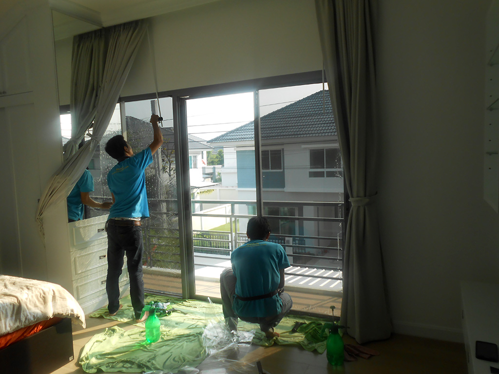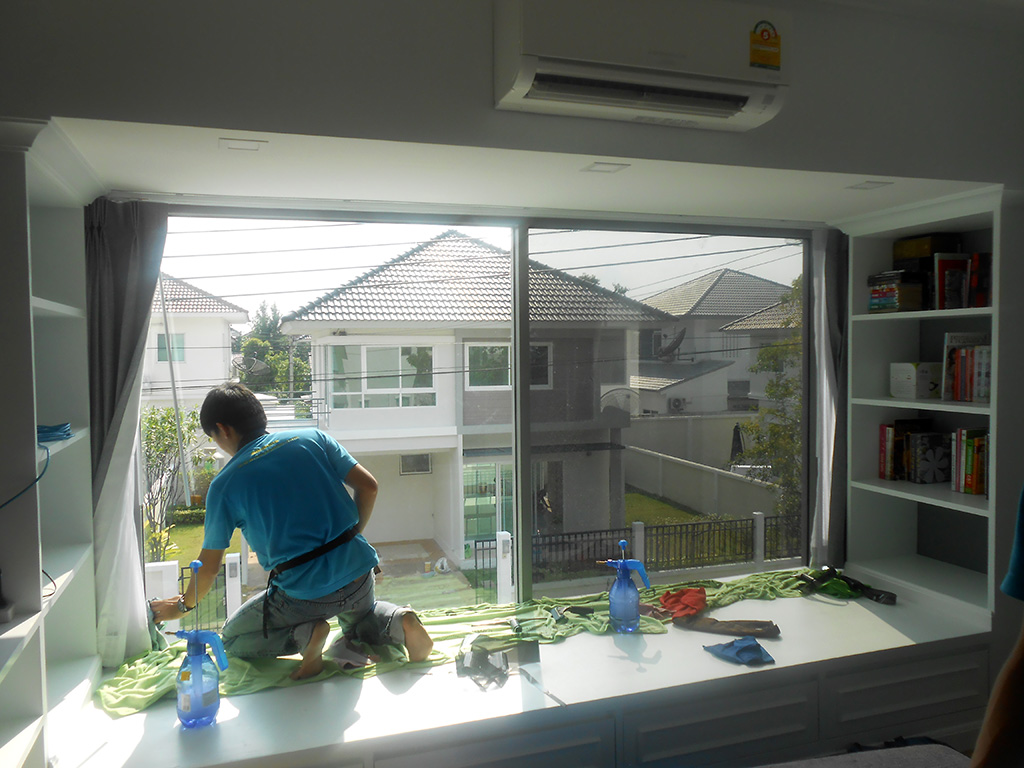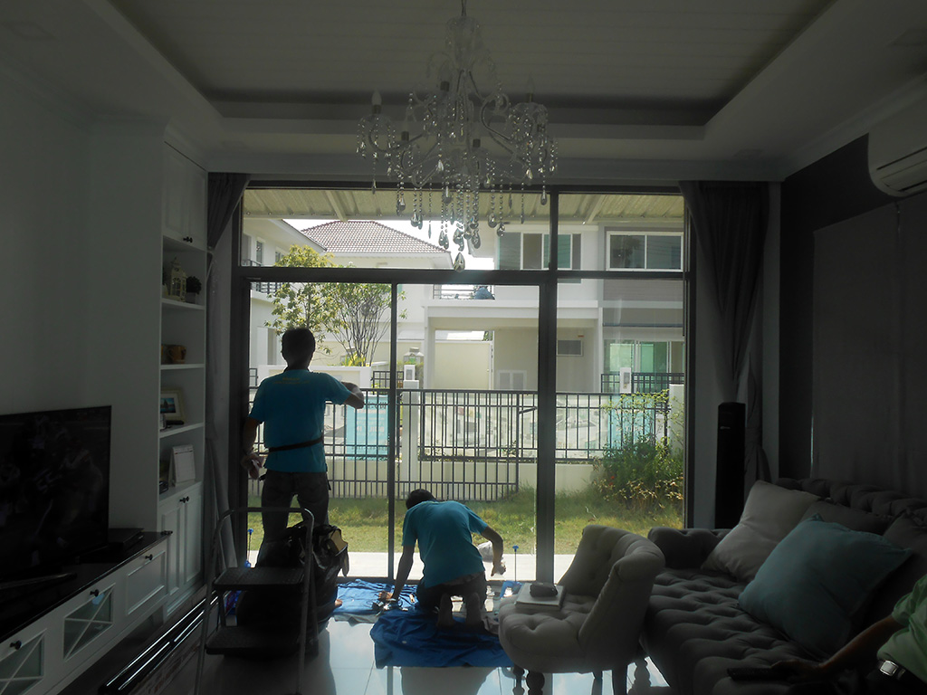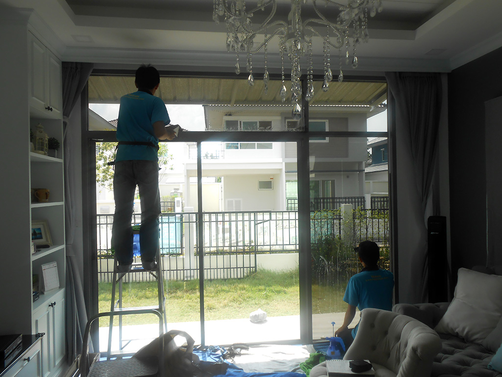 บ้านหลังนี้หันหน้าทางทิศตะวันตก ช่วงบ่ายแดดแรงมาก ร้อนอบอ้าว แอร์ทำงานหนัก จึงติดตั้งฟิล์มกรองแสงติดอาคารเพื่อลดความร้อนและแสงแดดก่อนที่จะเข้ามาภายในบ้าน ทำให้แสงจ้าลดลง ดูทีวีได้อย่างสบายตา และแอร์ทำงานน้อยลง แต่เย็นฉ่ำ ฟิล์มกรองแสงสำหรับอาคารที่เลือกใช้เป็น MAXGUARD รุ่น Steel15 เป็นฟิล์มกรองแสงสำหรับอาคารโดยตรง มีค่าแสงส่องผ่าน 18% ป้องกันรังสี Infrared 72% ป้องกันรังสี UV 99% มีค่าแสงสะท้อน 13% ค่าลดความร้อนรวม 65% ระยะเวลารับประกัน 7 ปี