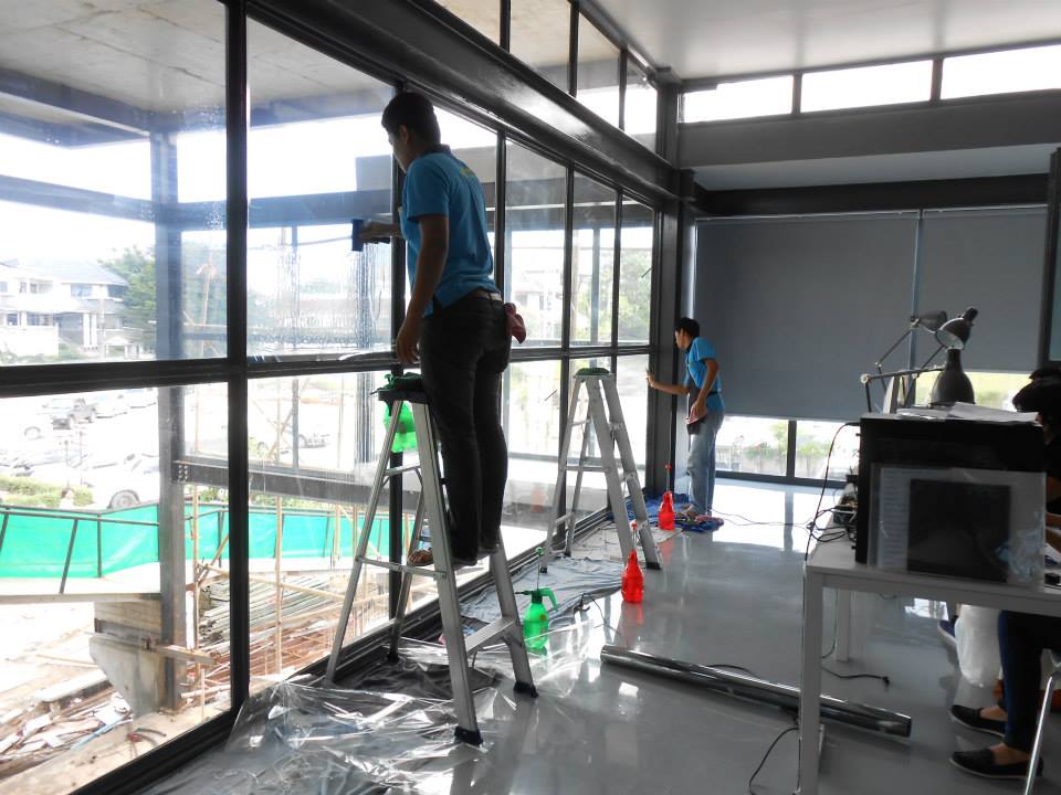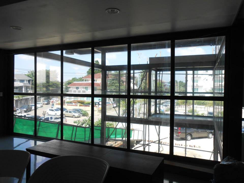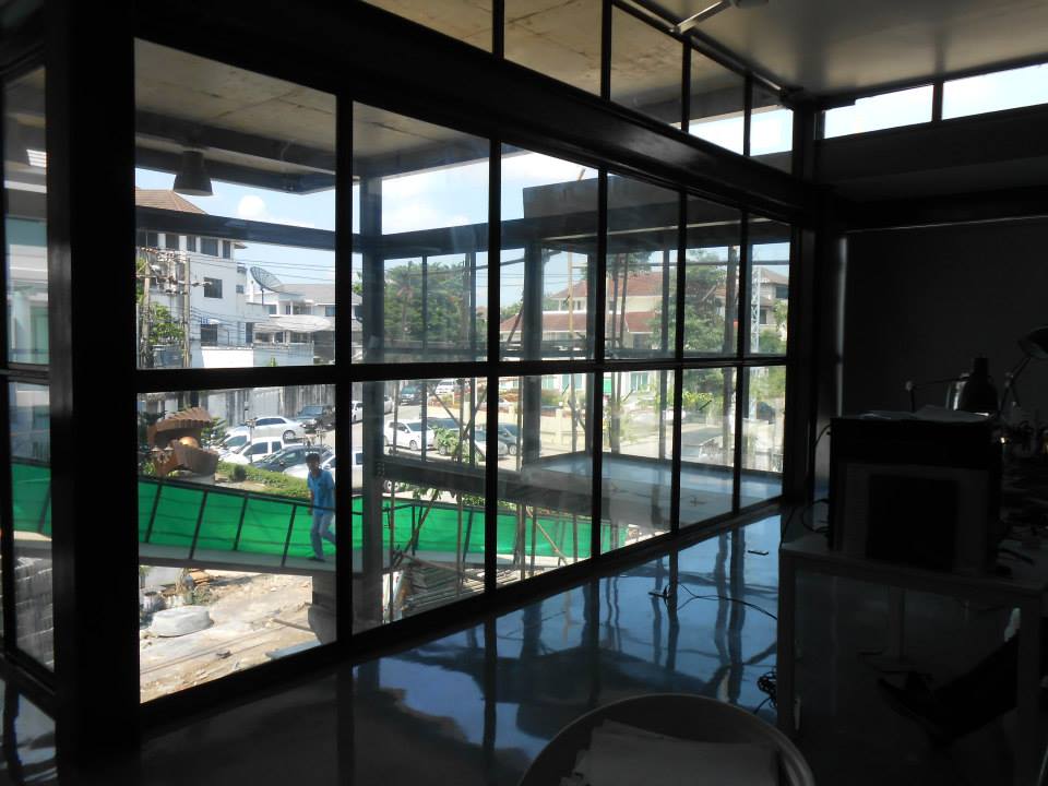 อาคารสไตล์ loft หลังนี้ใช้กระจกทั้งหลัง ทำให้แดดเข้าเกิดความร้อนเวลาทำงานไม่สะดวกสบาย จึงต้องติดฟิล์มกรองแสงเพื่อลดความร้่อน และพรางสายตา