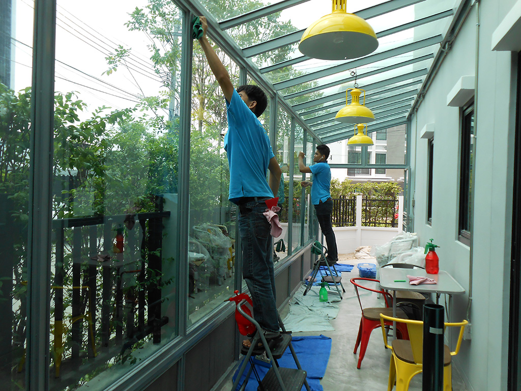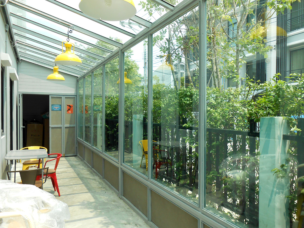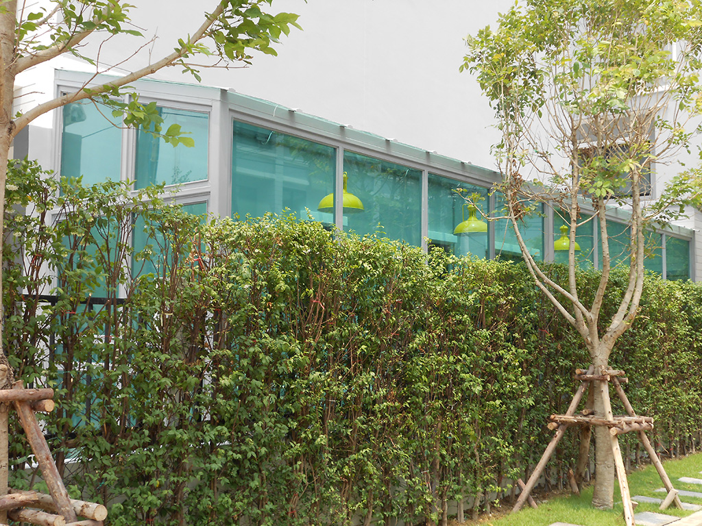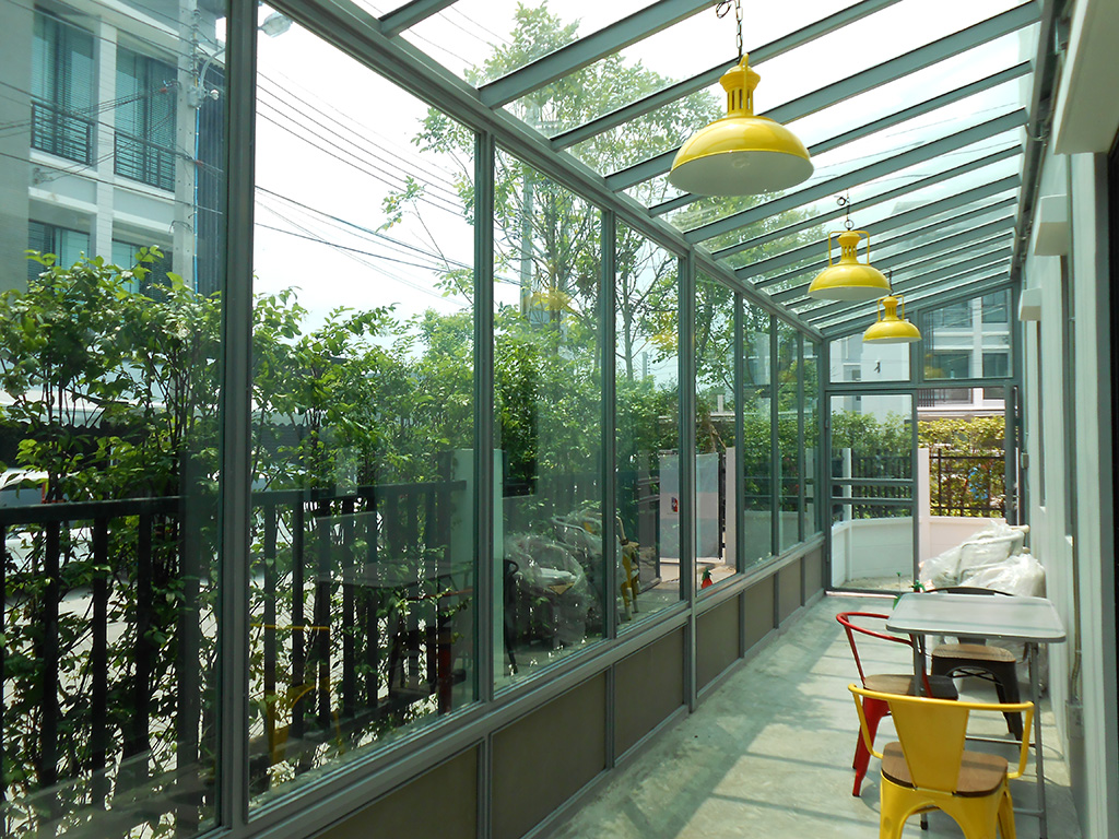 บ้านหลังนี้อยู่ในโครงการ บ้านกลางเมือง รามคำแหง-พระราม 9 เคยติดตั้งฟิล์มกรองแสงกันร้อนกับ เค ออโต้ฟิล์ม มาแล้ว ตอนนี้มีการต่อเติมด้านข้างทำเป็นห้องกระจกทั้งหลังคาและผนัง เลยต้องการติดฟิล์มนิรภัยเพื่อความปลอดภัยเมื่อกระจกแตก และรองรับแรงกระแทกได้มากขึ้น อีกทั้งยังสามารถลดความร้อน และป้องกันรังสี UV ได้อีกด้วย ฟิล์มกรองแสงนิรภัยที่เลือกใช้คือ Viewtech SAFETY ST BLUE 60 มีค่าแสงส่องผ่าน 63% ป้องกันรังสี UV 99% มีค่าแสงสะท้อน 13% ค่าลดความร้อนรวม 29% ระยะเวลารับประกัน 5 ปี