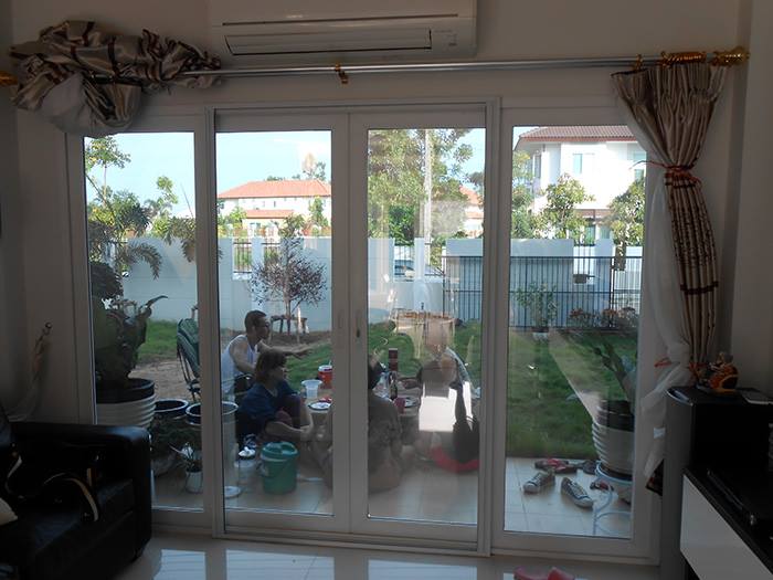 เจ้าของบ้านหลังนี้ซี้กับผู้จัดการฝ่ายขายครับ ทนการรบเร้าไม่ไหว จึงตัดสินใจติดฟิล์มกรองแสงบ้านเพื่อกันความร้อน และรักษาความเป็นส่วนตัวในยามพักผ่อน โดยติดที่ห้องรับแขก ซึ่งเป็นห้องเอนกประสงค์ ทั้งรับแขก นั่งเล่น ดููทีวี ทานข้าว หลังจากติดตั้งเสร็จแล้ว เจ้าของบ้านถูกใจเป็นอย่างมาก เลยสั่งติดฟิล์มส่วนที่เหลือทั้งหมด ฟิล์มที่ใช้เป็นฟิล์ม Smarttec SM-P 18 มีค่าแสงส่องผ่าน 20% ป้องกันรังสี UV 99% มีค่าแสงสะท้อน 18% ค่าลดความร้อนรวม 82.4% ระยะเวลารับประกัน 7 ปี