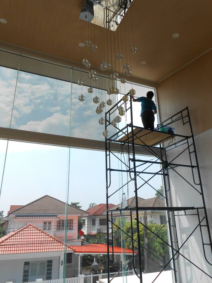 บ้านหลังนี้สร้างใหม่จากพื้นที่เดิม เจ้าของบ้านออกแบบเองให้มีกระจกเยอะๆ เพราะชอบโล่งๆ เมื่อมีกระจกเยอะก็รับแสงแดดเยอะ ทำให้ร้อนมากโดยเฉพาะห้องโถงใหญ่ จึงใช้ฟิล์มกรองแสงเพื่อลดความร้อนดังกล่าว