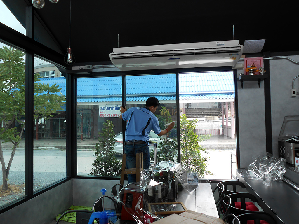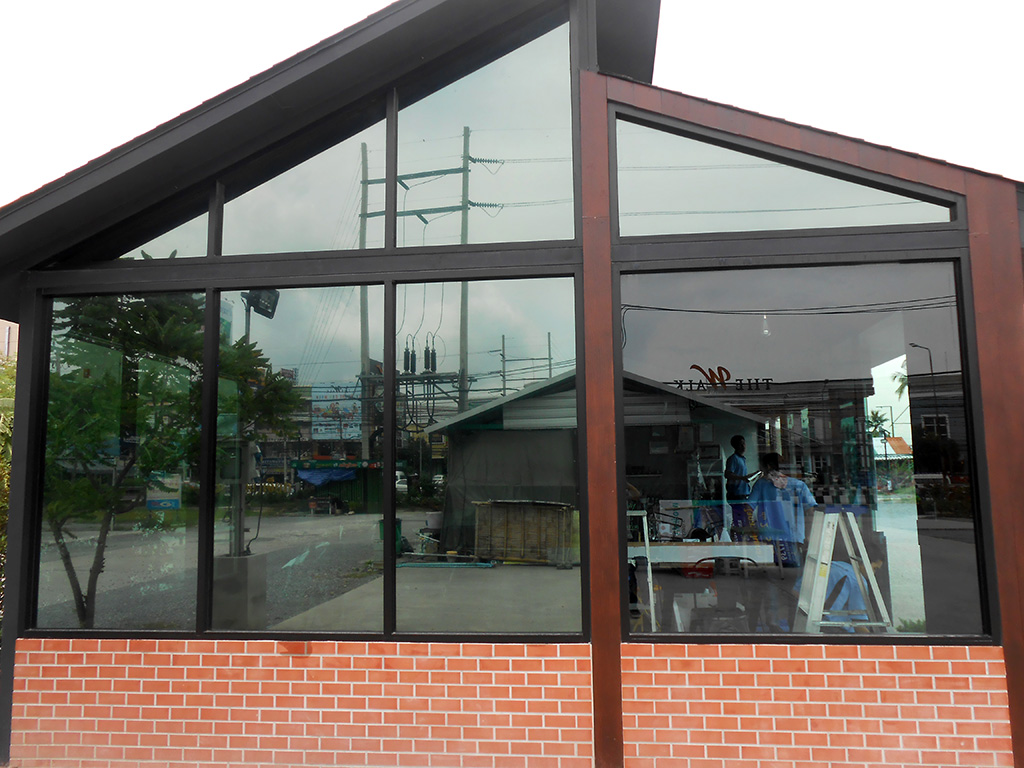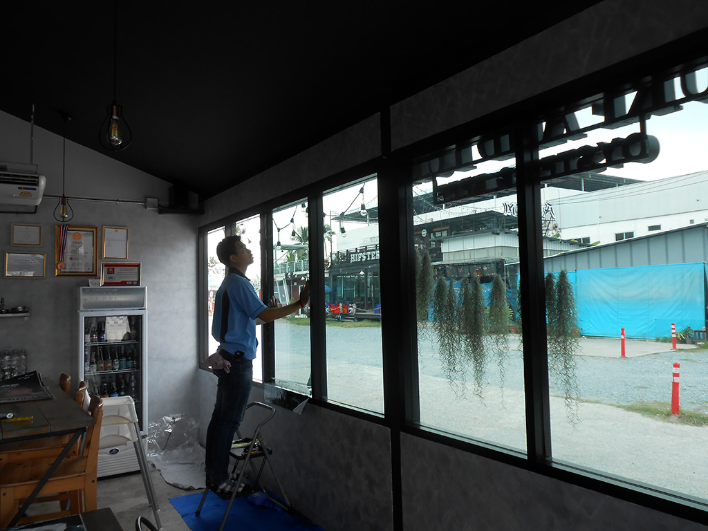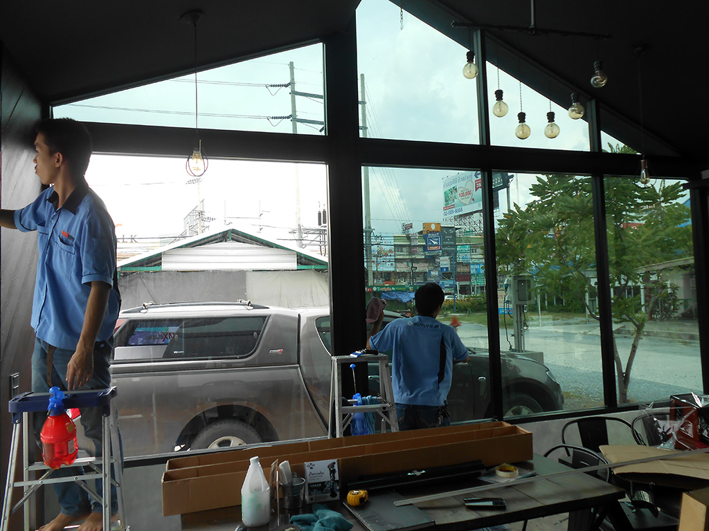 ด้วยทำเลที่ตั้งอยู่กลางพื้นโล่งที่โอบล้อมด้วยปูน ทำให้เวลาแดดออกแสงจ้าและร้อนมาก เพราะไอร้อนจากแสงแดดโดยตรงที่ส่องเข้ามาผนวกกับไอร้อนที่สะท้อนมาจากพื้นปูน ส่งผลให้เวลากลางวันแอร์สองตัวทำงานหนักและไม่ค่อยเย็น เจ้าของร้านจึงตัดสินใจติดตั้งฟิล์มกรองแสงอาคาร เพื่อลดปัญหาจากความร้อนดังกล่าว ฟิล์มกรองแสงอาคารที่เลือกใช้เป็นของ NEXFIL รุ่น RD52 เขียวปรอท ซึ่งมีสเปคดังนี้