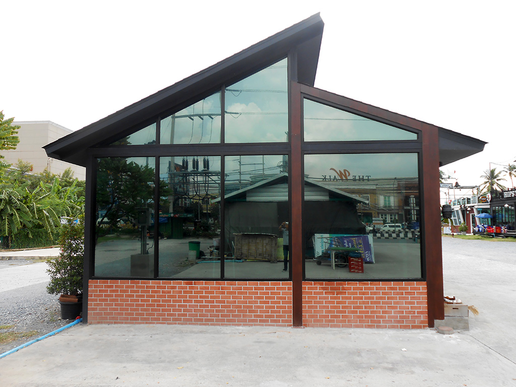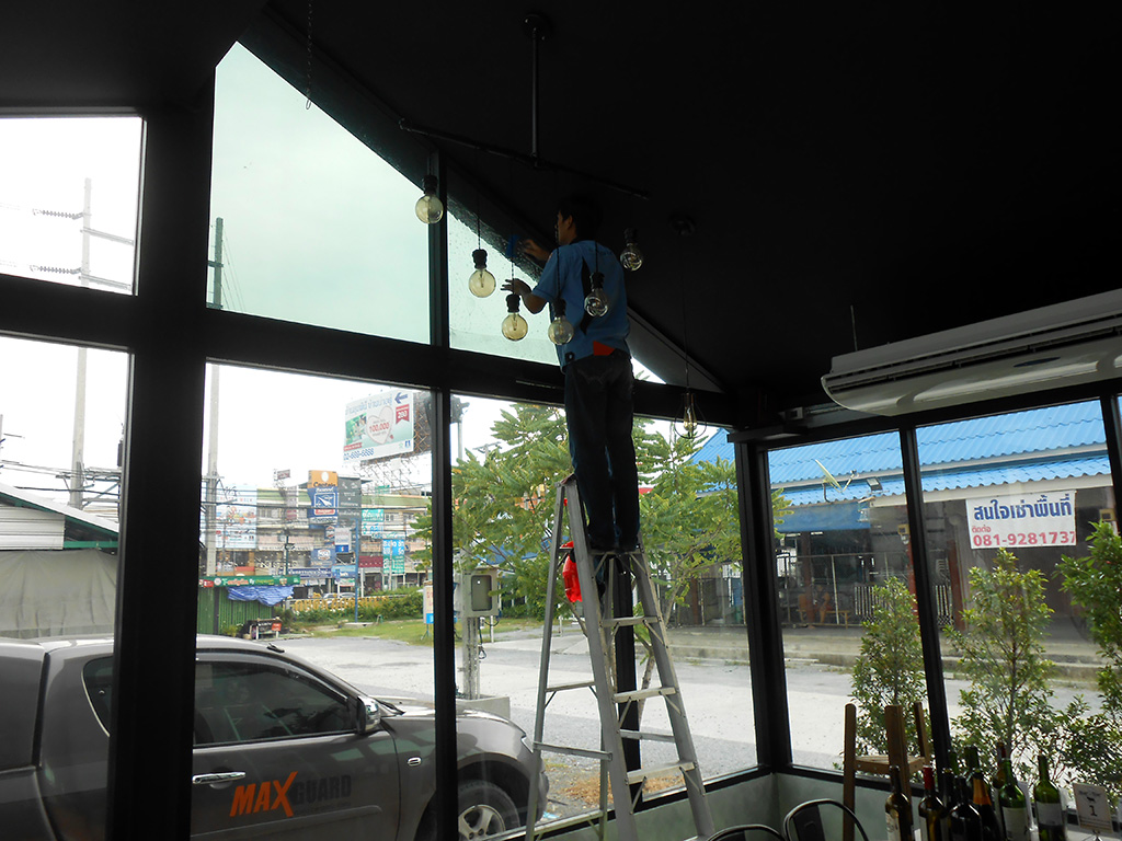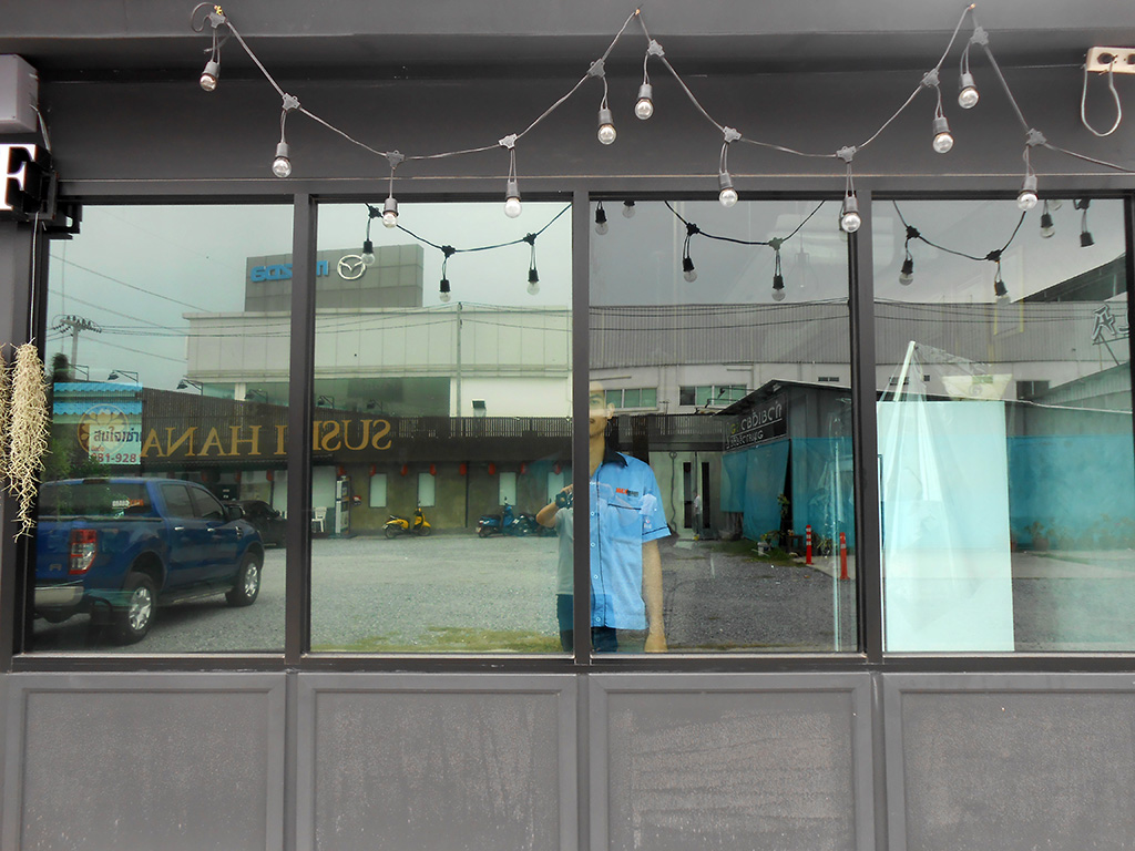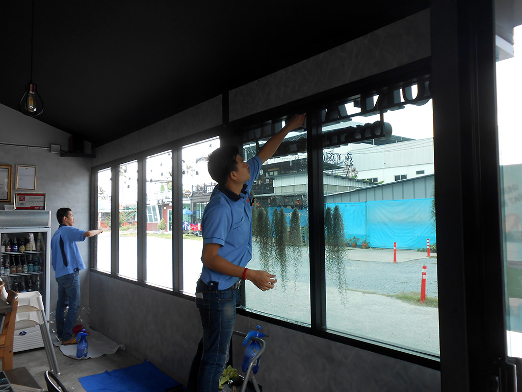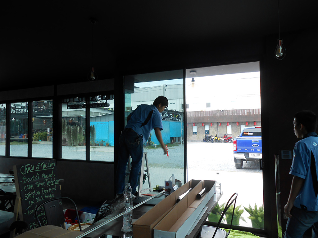 ด้วยทำเลที่ตั้งอยู่กลางพื้นโล่งที่โอบล้อมด้วยปูน ทำให้เวลาแดดออกแสงจ้าและร้อนมาก เพราะไอร้อนจากแสงแดดโดยตรงที่ส่องเข้ามาผนวกกับไอร้อนที่สะท้อนมาจากพื้นปูน ส่งผลให้เวลากลางวันแอร์สองตัวทำงานหนักและไม่ค่อยเย็น เจ้าของร้านจึงตัดสินใจติดตั้งฟิล์มกรองแสงอาคาร เพื่อลดปัญหาจากความร้อนดังกล่าว ฟิล์มกรองแสงอาคารที่เลือกใช้เป็นของ NEXFIL รุ่น RD52 เขียวปรอท ซึ่งมีสเปคดังนี้