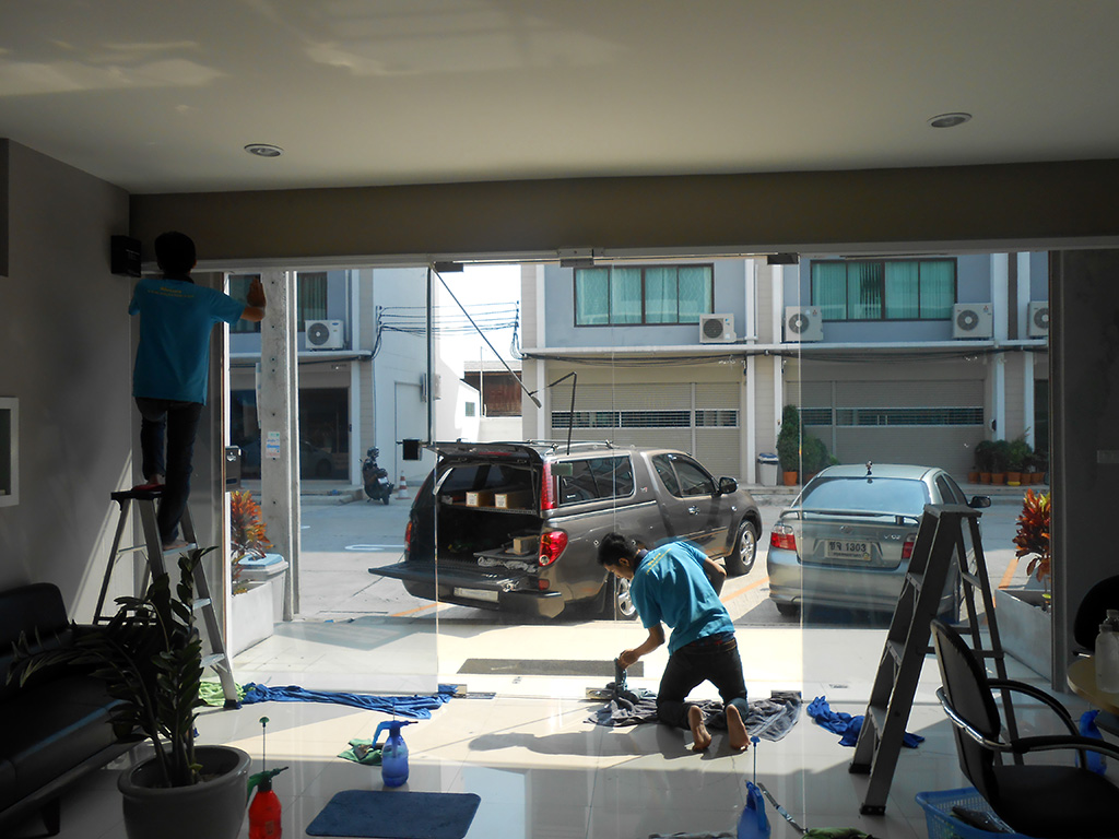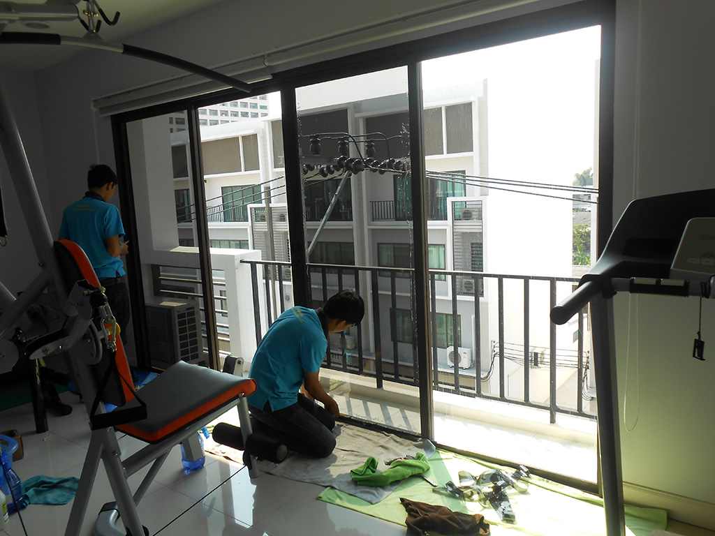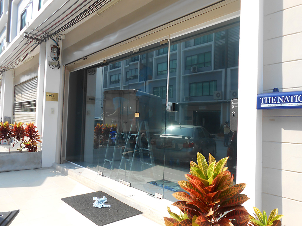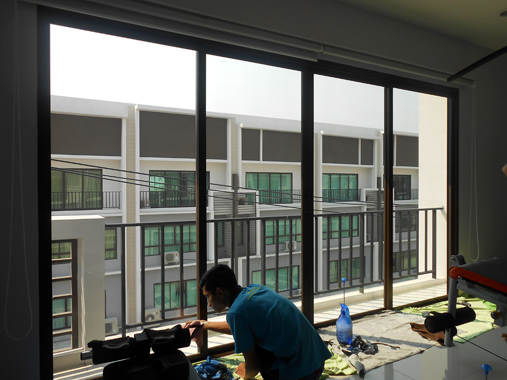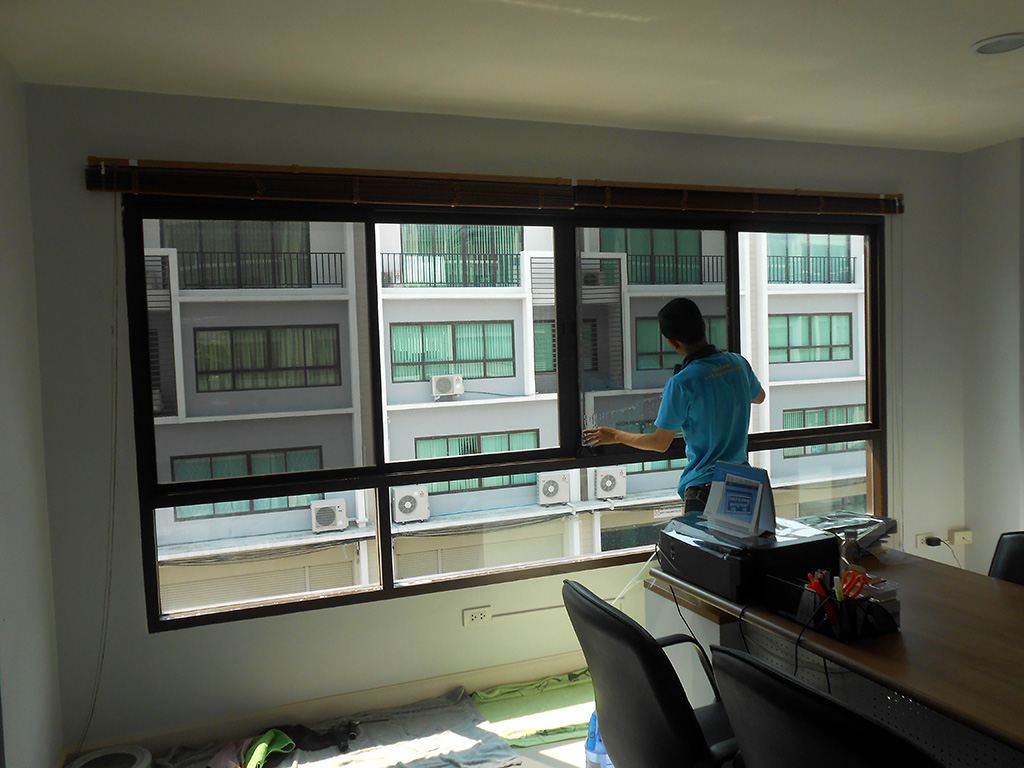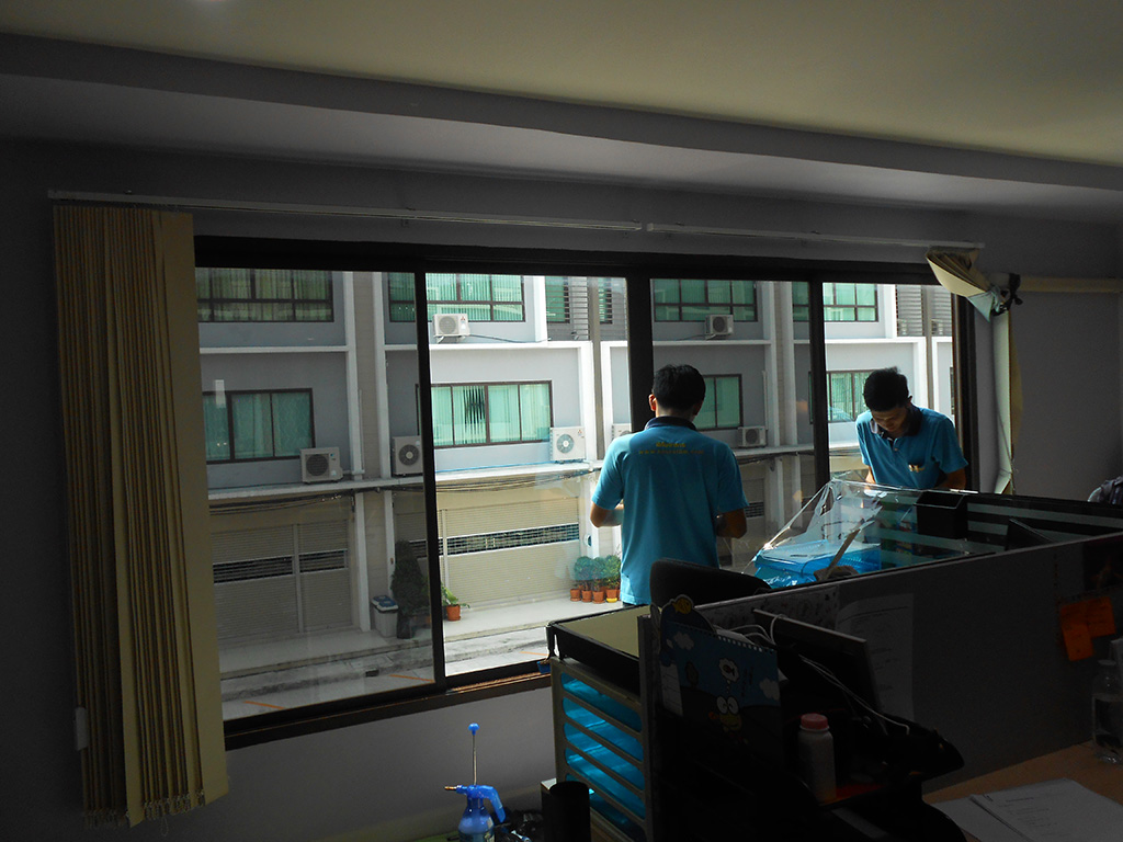 ทาวน์โฮม 3 ชั้น ตกแต่งเป็นออฟฟิศบริษัท แดดเข้าตั้งแต่ตอนสาย-เย็น ทำให้พนักงานทำงานไม่สะดวก แดดจ้าทั้งวัน ไอร้อนเข้า แอร์ทำงานหนัก ถึงแม้จะมีม่านบังแดดแล้วก็ตาม จึงตัดสินใจติดตั้งฟิล์มกรองแสงอาคาร โดยเลือกใช้ของ MAXGUARD ซึ่งเป็นฟิล์มกรองแสงสำหรับติดอาคารโดยตรง ฟิล์มกรองแสงอาคารที่เลือกใช้เป็น รุ่น Steel15 มีค่าแสงส่องผ่าน 18% ป้องกันรังสี Infrared 72% ป้องกันรังสี UV 99% มีค่าแสงสะท้อน 13% ค่าลดความร้อนรวม 65% ระยะเวลารับประกัน 7 ปี สำหรับชั้นบน และชั้นล่างเลือกใช้ฟิล์มกรองแสงอาคารรุ่น Chrome 42 มีค่าแสงส่องผ่าน 45% ป้องกันรังสี Infrared 75% ป้องกันรังสี UV 99% มีค่าแสงสะท้อนภายใน 18% ค่าแสงสะท้อนภายนอก 22% ค่าลดความร้อนรวม 61% ระยะเวลารับประกัน 7 ปี