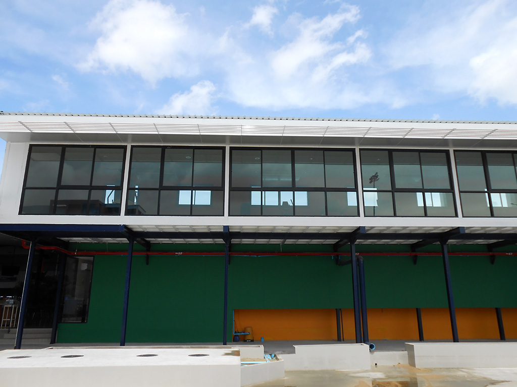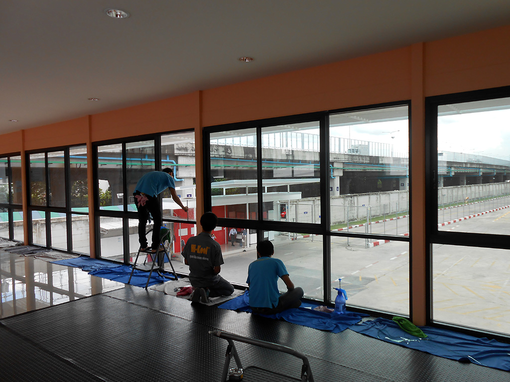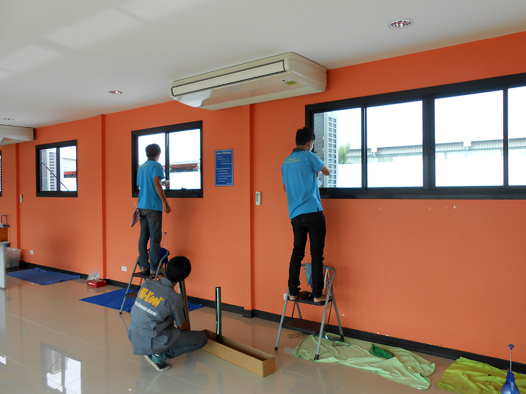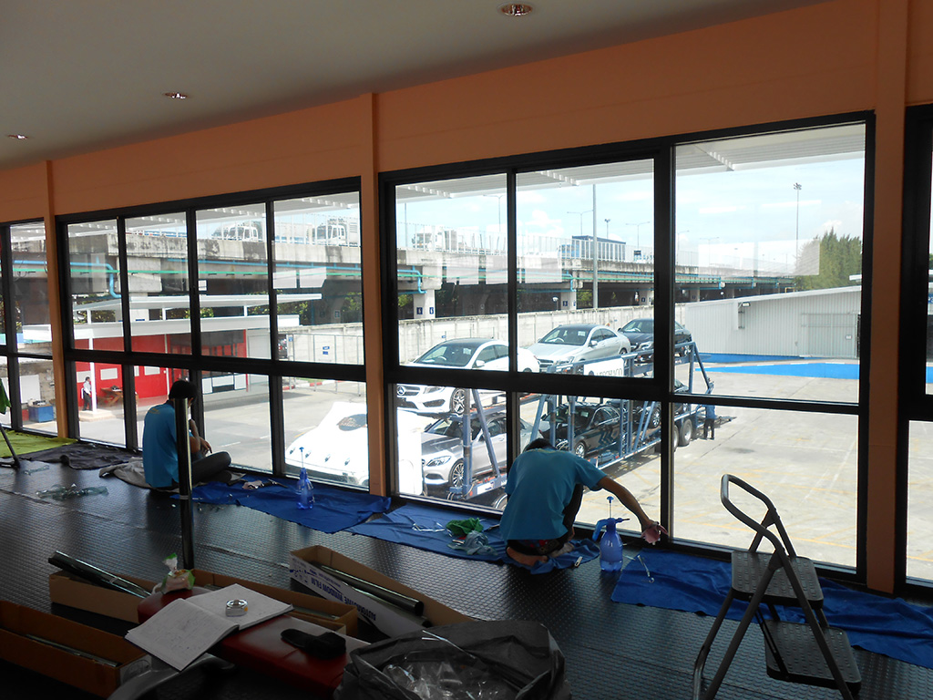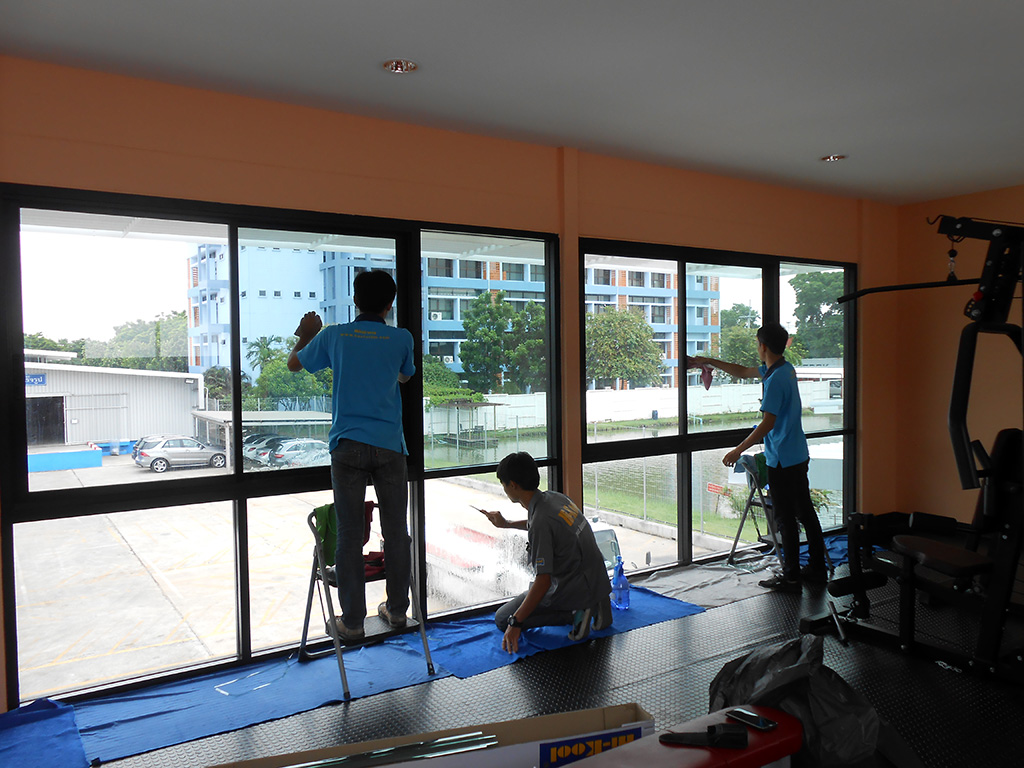 ที่ ธนบุรีประกอบรถยนต์ ได้จัดทำห้อง fitness เพื่อให้พนักงานได้ออกกำลังกาย แต่ช่วงบ่าย-เย็น แดดเข้าเต็มๆ ร้อนมาก จึงติดตั้งฟิล์มกรองแสงอาคาร เพื่อลดความร้อน และประหยัดพลังงาน แต่ยังสามารถมองเห็นภายในได้อยู่ ฟิล์มกรองแสงที่เลือกใช้เป็น Hi-Kool R10 เขียวใส มีค่าแสงส่องผ่าน 50% ป้องกันรังสี UV 99% มีค่าแสงสะท้อน 12% ค่าลดความร้อนรวม 60% ระยะเวลารับประกันนาน 7 ปี